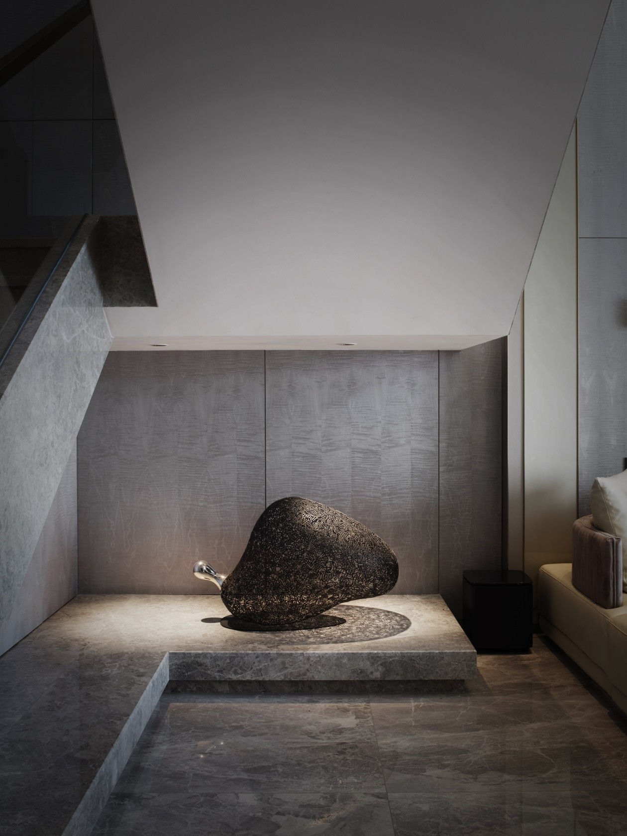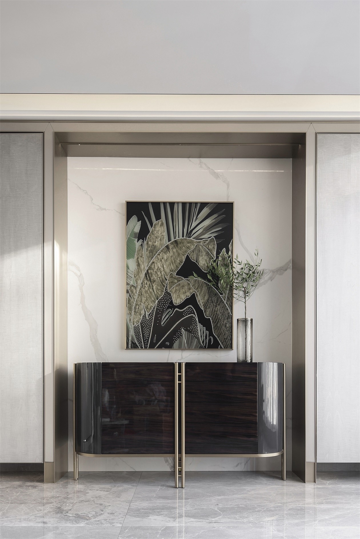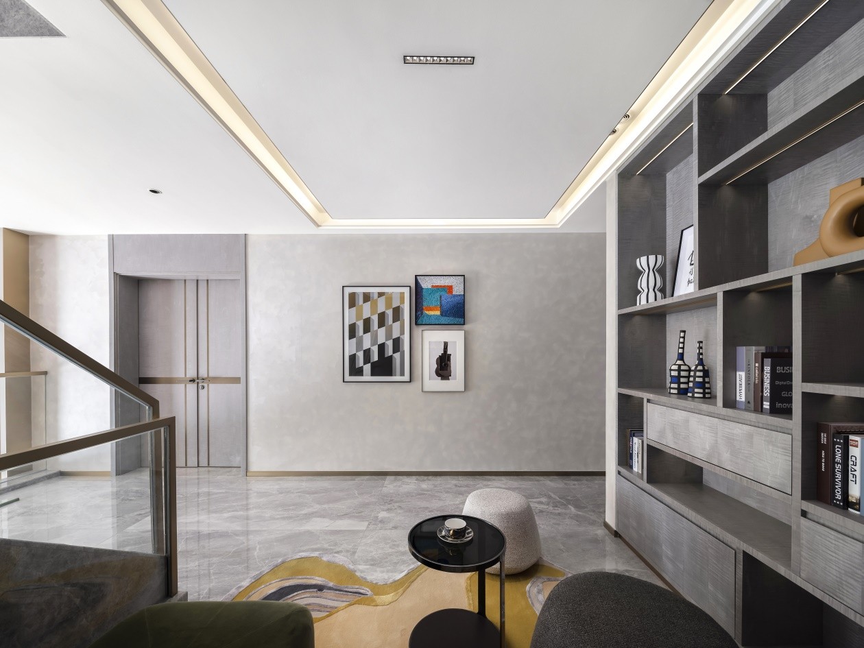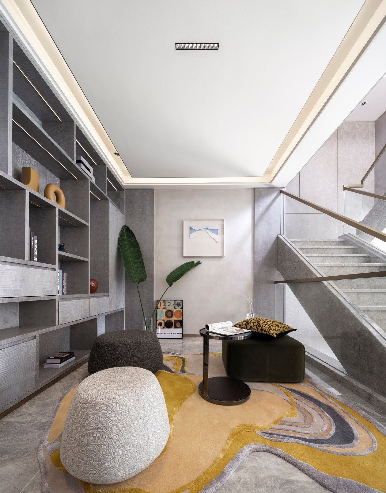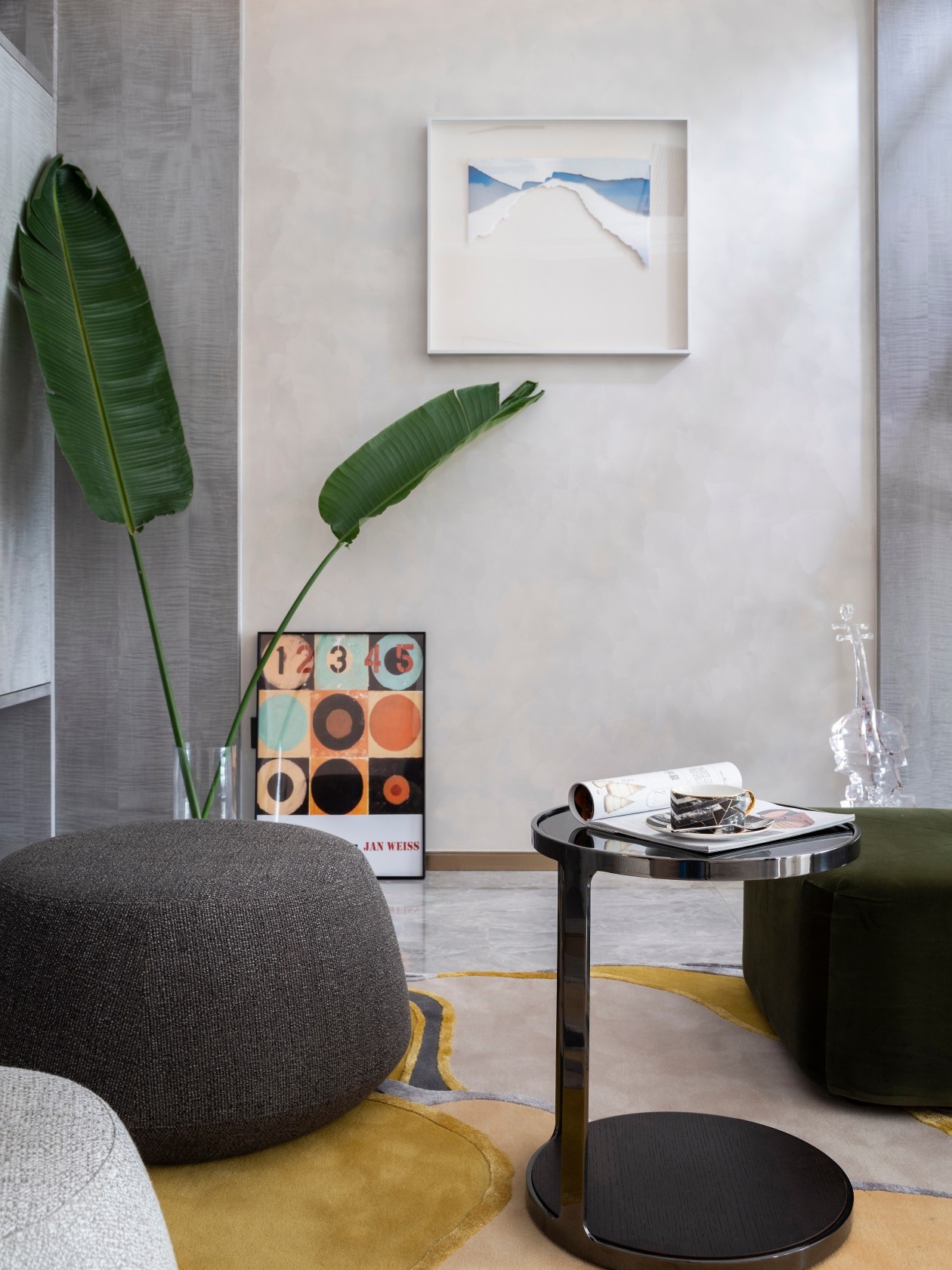 休閑區(qū)是公共區(qū)域和私人空間的過渡區(qū)域,硬裝的灰色大理石和柜體,沉穩(wěn)卻缺少了一絲生氣。所以軟裝則以飽和度較高的色彩為主色調(diào),為空間增添了幾分活躍的色彩,異形的地毯、創(chuàng)意的擺件、有趣的抱枕、多變的掛畫讓整個(gè)空間的氛圍輕松愉悅
