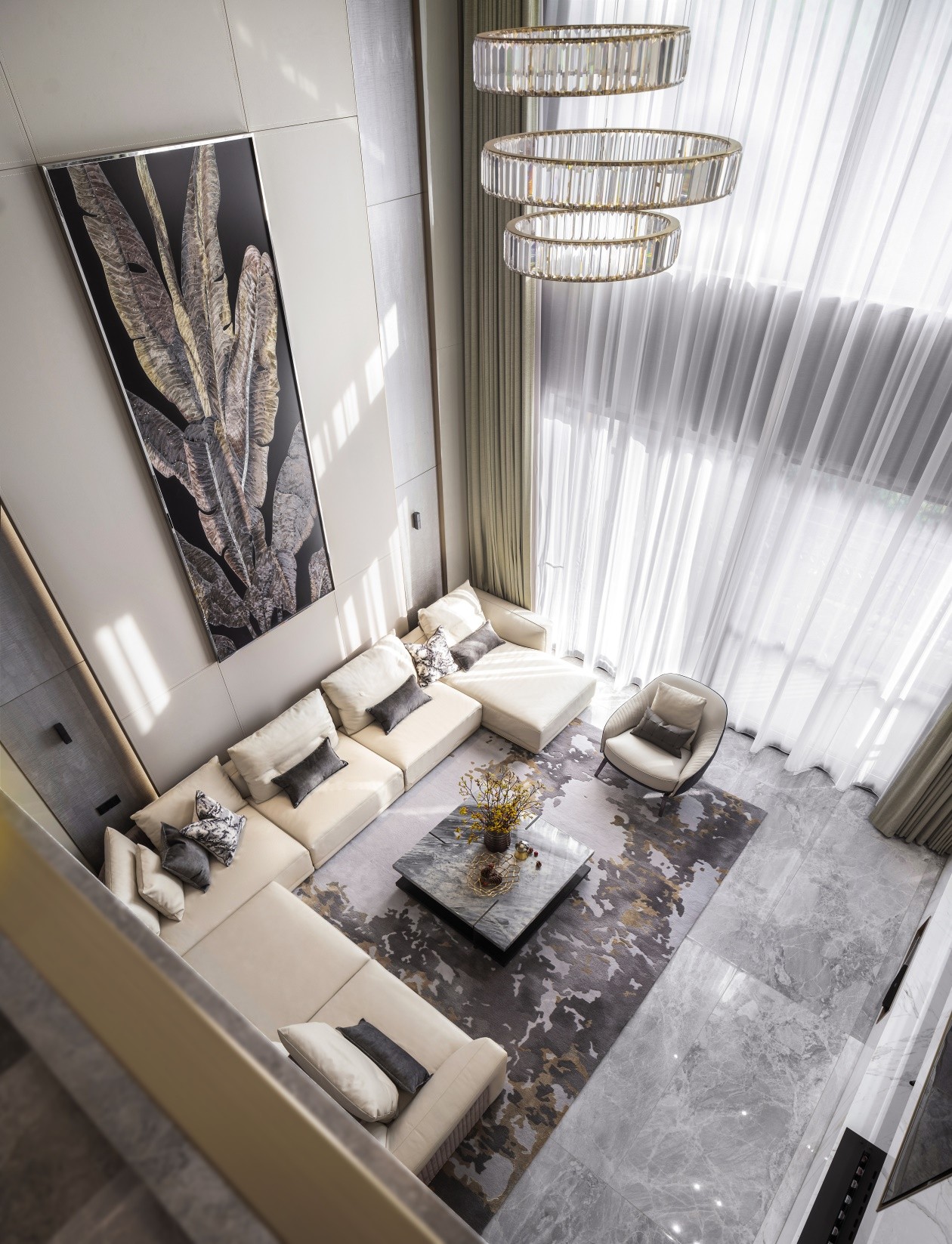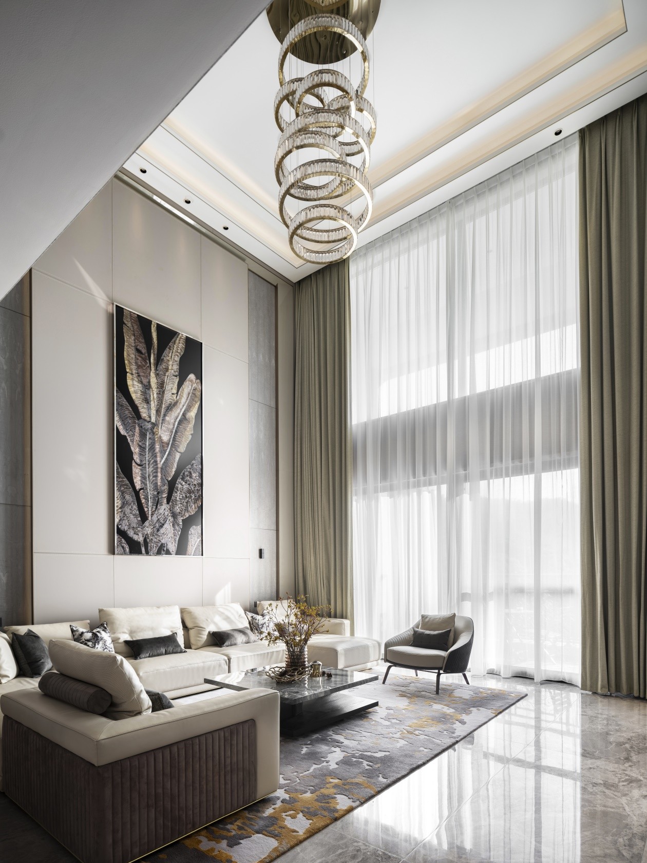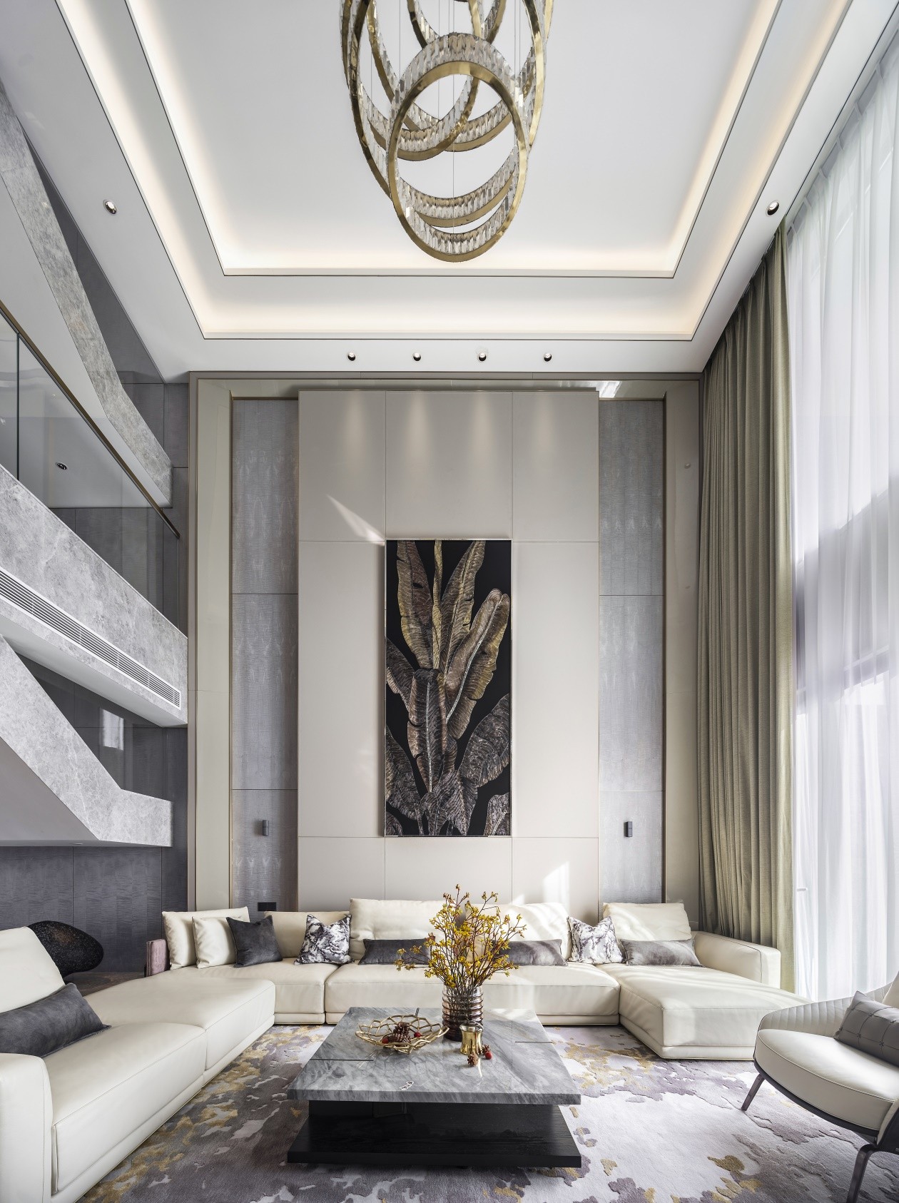 一層的核心空間是客廳,兩層挑空的客廳寬敞明亮,搭配大尺寸的琺瑯琉璃裝飾畫更顯大氣。金屬元素是輕奢空間不可缺少的角色,客廳的水晶吊燈選用自帶光效的金屬和水晶配合多層疊造型,起到畫龍點(diǎn)睛的效果,營造出輕奢華麗、時(shí)尚大氣的空間氛圍。冬日的午后,陽光透過紗