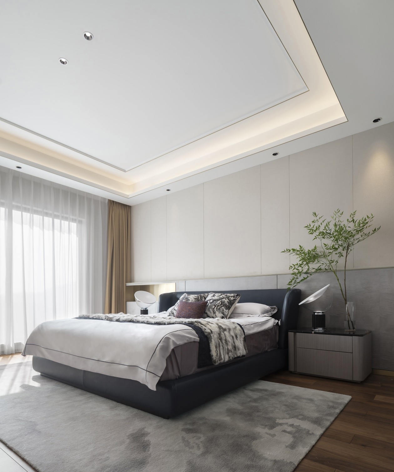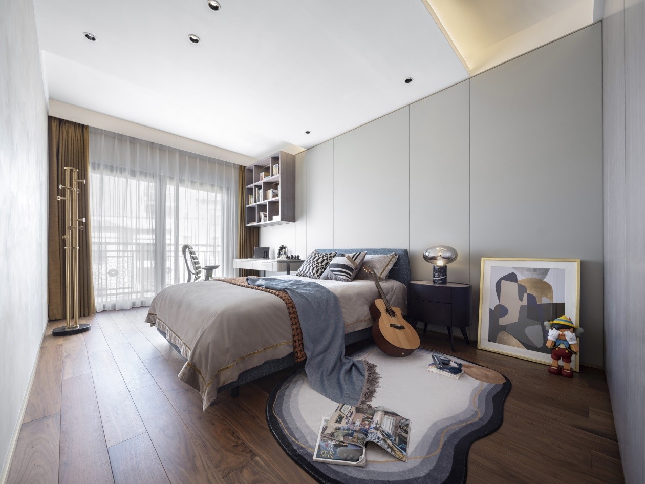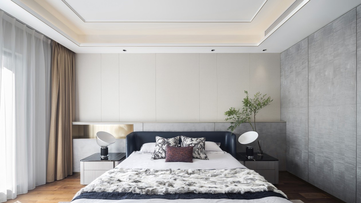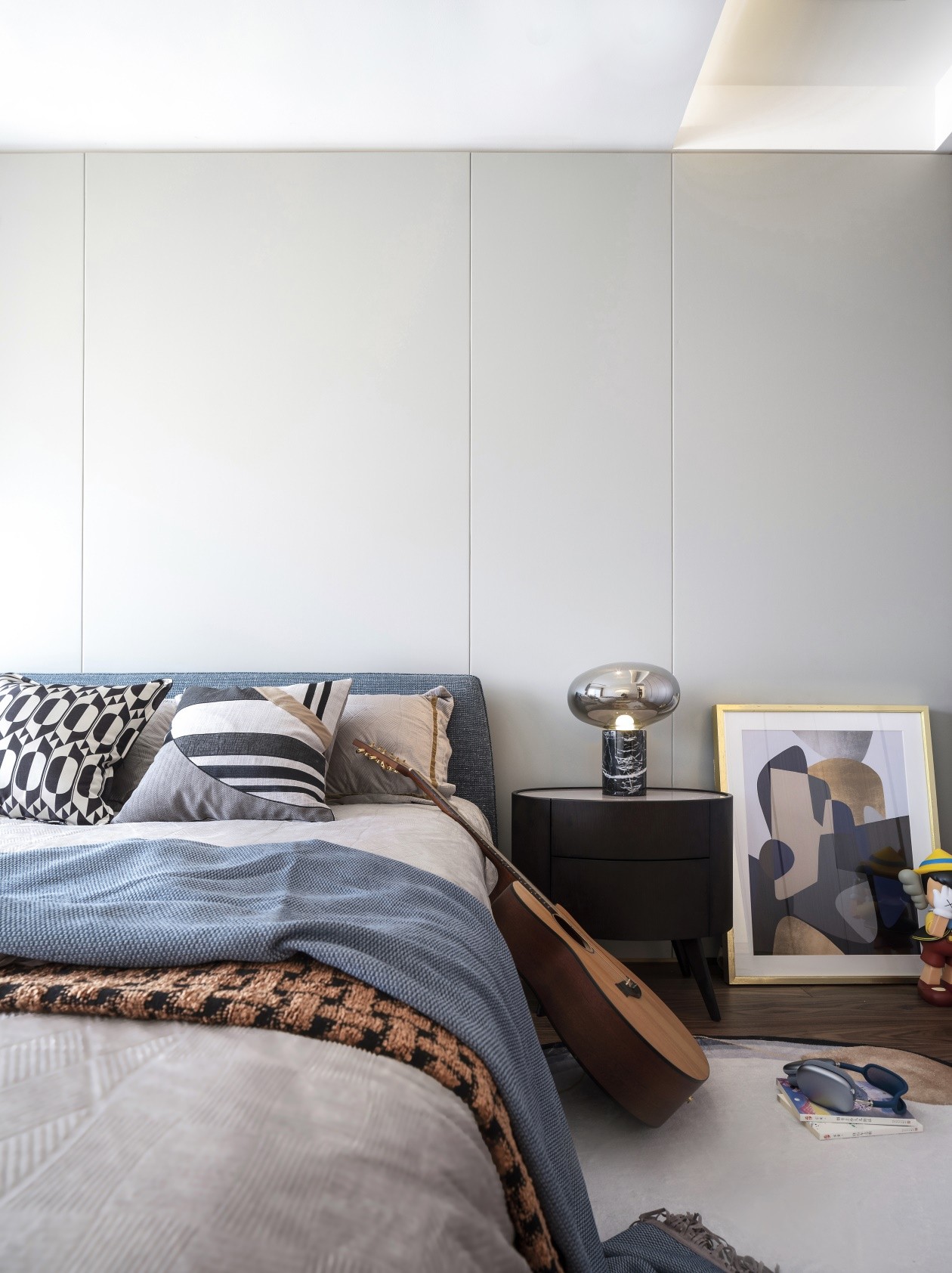 主臥空間大氣、穩(wěn)重,與業(yè)主本身的氣質(zhì)相得益彰。色調(diào)中有輕松的灰白色、穩(wěn)重的深藍(lán)色、柔和的芥末黃,雖是互補(bǔ)色卻能很好的和諧共生,家具造型簡潔卻氣場強(qiáng)大,共同打造出舒適、輕奢、高雅的空間狀態(tài),彰顯居者的精尚品位。