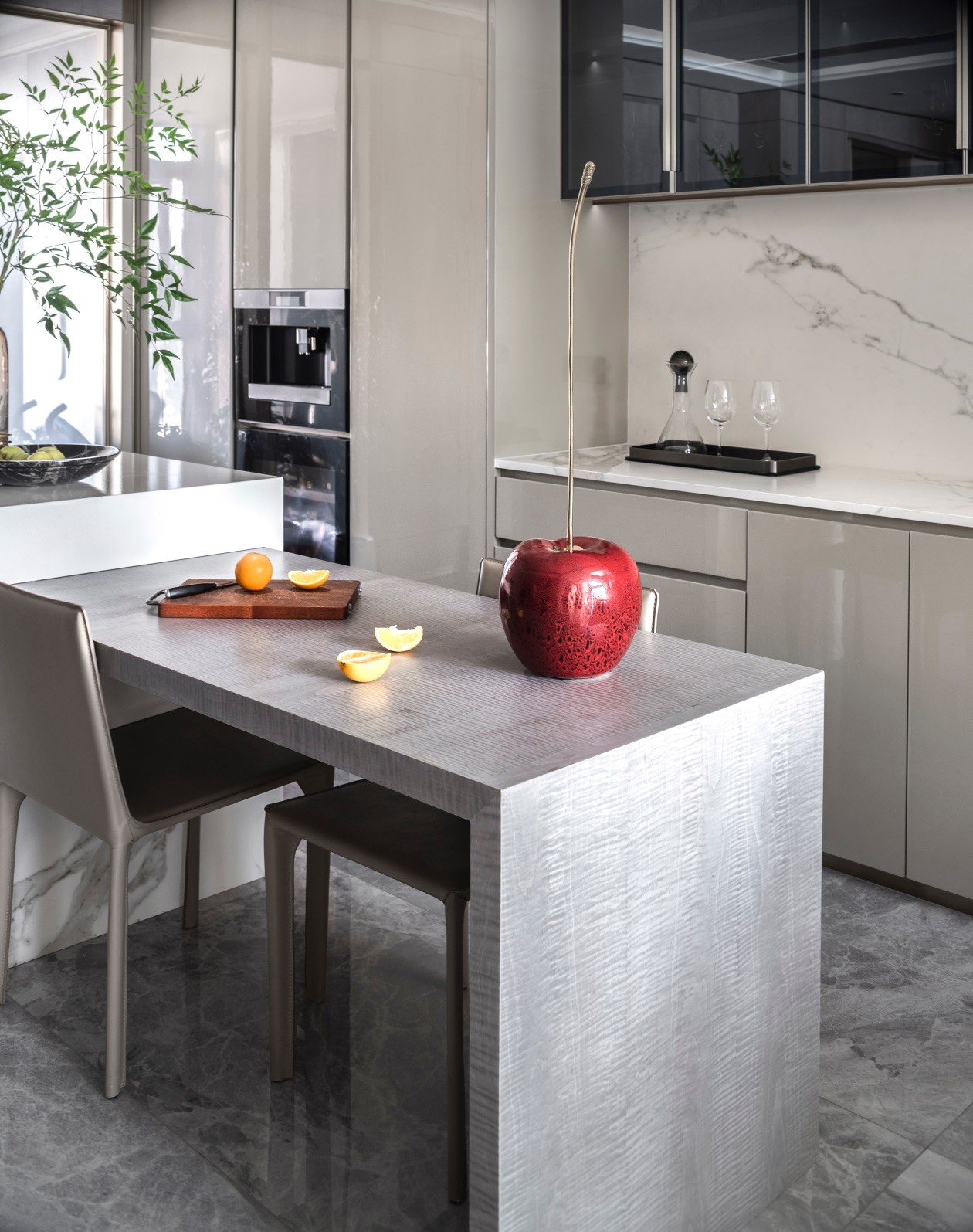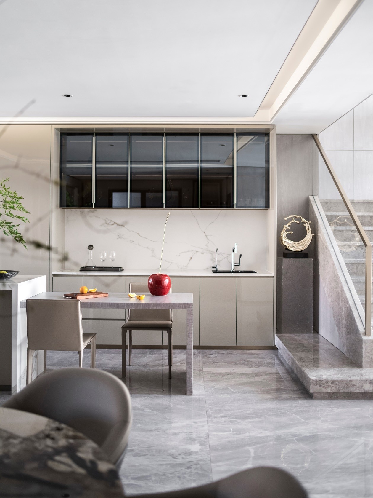 開放式吧臺增強(qiáng)了與餐廳的聯(lián)系,潘多拉奢石的餐桌,華麗卻不艷俗,猶如高貴的女王,氣場全開。餐椅選用簡約卻充滿細(xì)節(jié)的款式,沒有喧賓奪主,猶如溫柔的騎士,低調(diào)沉穩(wěn)。整個(gè)餐飲空間的每個(gè)角落都散發(fā)著品質(zhì)與優(yōu)雅的紳士生活氣息。