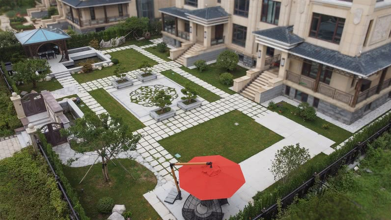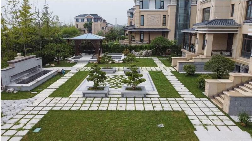 運(yùn)用園林汀步作為空間之間的連接,間隙有草綠點(diǎn)綴,規(guī)整又有韻律,庭院正中心的花崗巖拼花,是整個(gè)院子的點(diǎn)睛之筆,設(shè)計(jì)師將花崗巖做雕刻處理,將縫隙用種植草填充,作為入戶(hù)景觀(guān)既不遮擋視線(xiàn)又極具觀(guān)賞性。