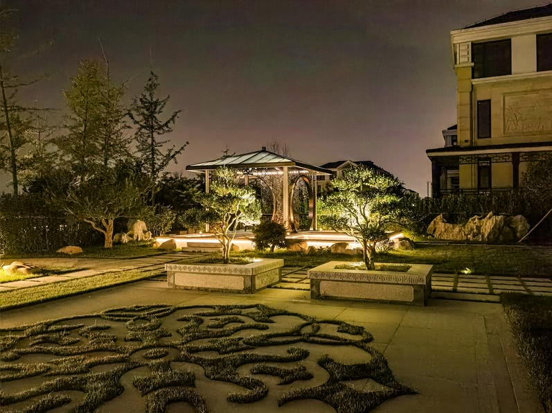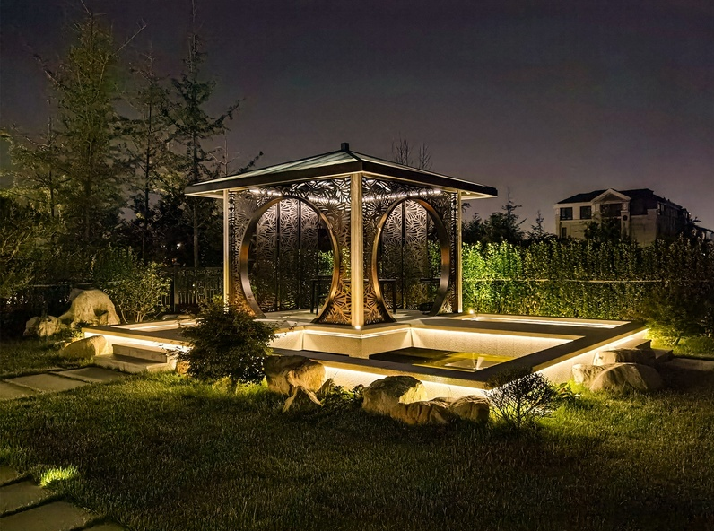 涼亭的設(shè)計(jì)也是設(shè)計(jì)師匠心獨(dú)運(yùn)的體現(xiàn),運(yùn)用鋼板鏤空雕花,做月亮門(mén),白天光影斑駁,水系水影婆娑,詩(shī)情畫(huà)意,品一杯茶,賞一會(huì)游魚(yú),看一會(huì)湖景,悠哉游哉。